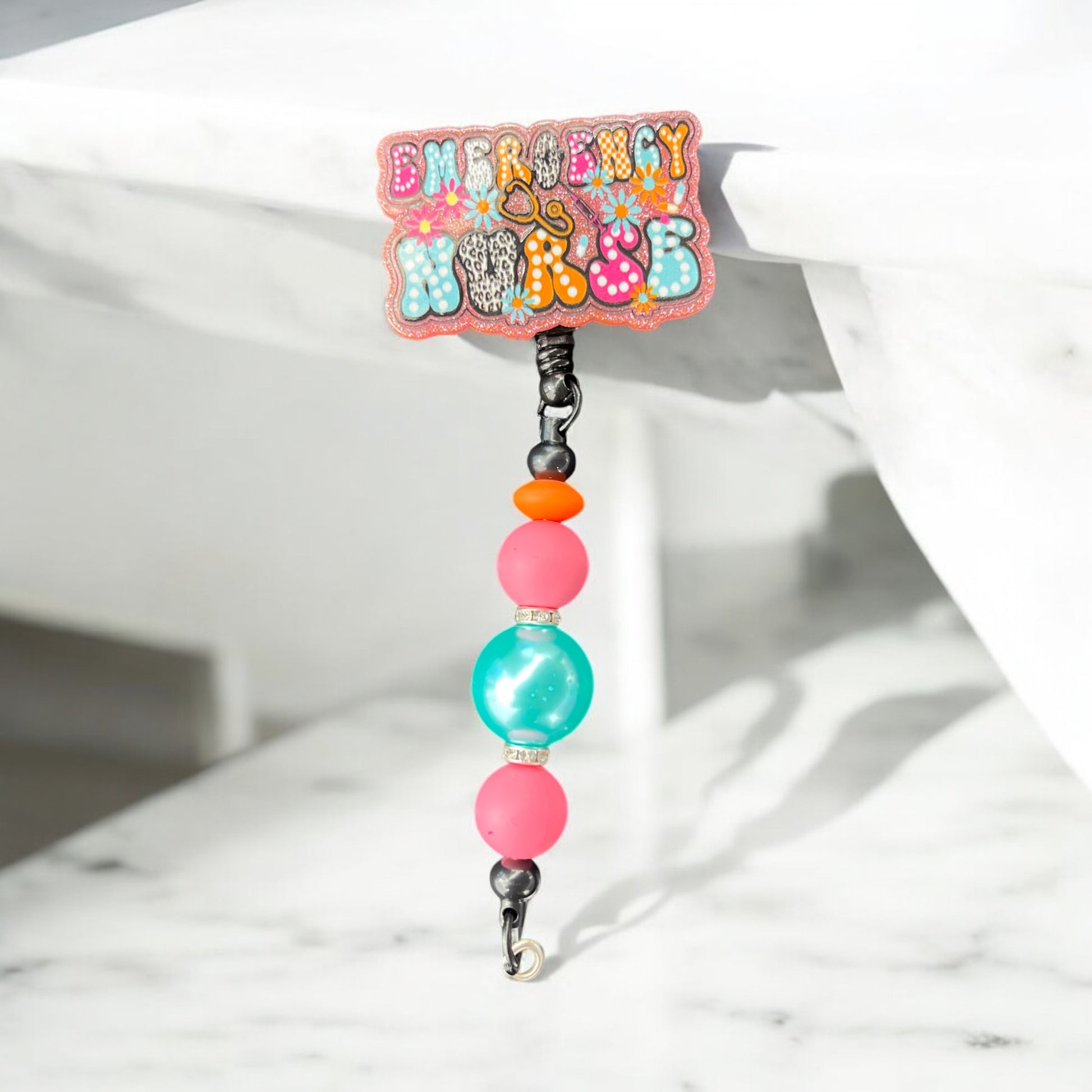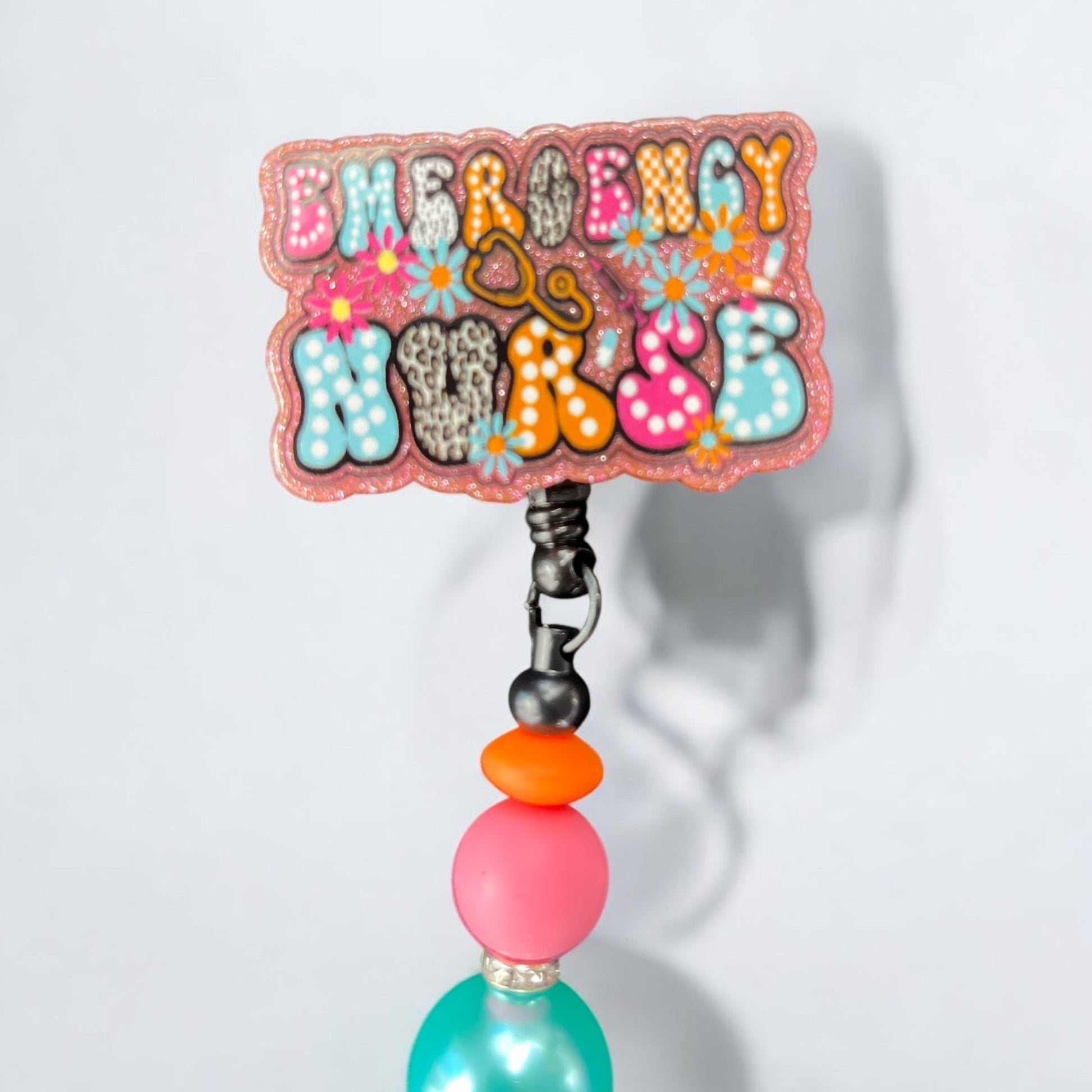 Retractable Badge Reel with colorful beads and a slide on attachment